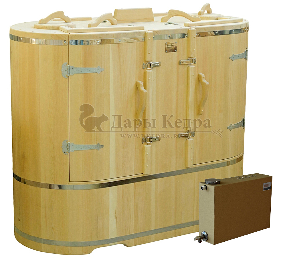 Готовый комплект - это полностью укомплектованный набор с двухместной фитобочкой для процедур парения. Такая модель подходит как для коммерции, так и для домашнего использования. Позволяет одновременно принимать процедуры сразу двум людям. Фитобочка изготавливается в двух размерах 1400 мм и 1600 мм (с перегородкой). Она оборудована откидными створками, дверцей, отверстием для головы и перегородкой (в зависимости о модели). Во время парения человек находится внутри кедровой бочки, а голова снаружи. Благодаря этому исключается возможность перегрева.
